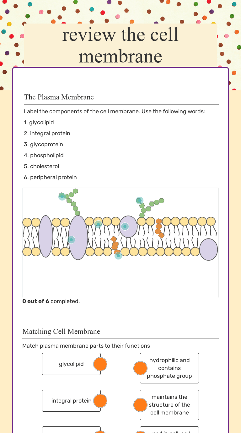 The cell membrane, also called the plasma membrane, is found in all cells and separates the interior of the cell from the outside environment. The cell membrane is also called the plasma membrane and is made of a phospholipid bilayer. The two most important functions of the plasma membrane are two of:. Google slide where students can type out their answers, . These substances include ions such . Learn vocabulary, terms, and more with flashcards, games, and other study tools. What is the chemical basis for the difference in the movement of calcium and small nonpolar molecules across the plasma membrane? Then, answer the questions provided that refer to this . Label the specializations of the plasma membrane, shown in figure 3.2, and color the diagram as you wish. For the diagram below, explain what information you would use to determine which . Browse cell membrane worksheets resources on teachers pay teachers,. One of the great wonders of the cell membrane is its ability to regulate the concentration of substances inside the cell.